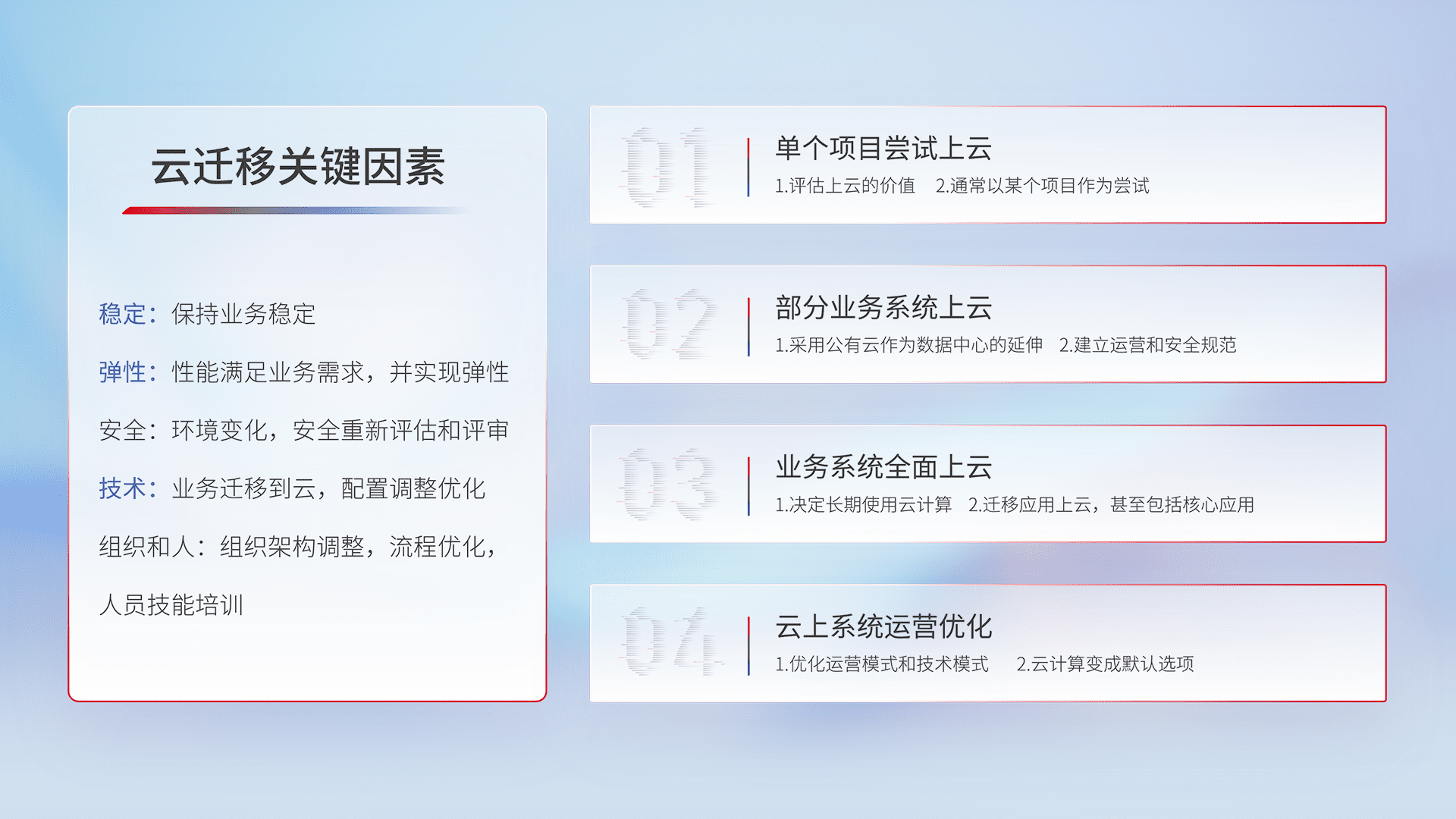 结合实际业务,,,从规划设计、、、、云平台选型、、云原生改造、、、数据迁移、、集成交付,,,迁移全过程为客户识别最佳上云路径,,,做好风险识别管理,,,设计网络架构、、身份权限、、安全审计合规、、操作审计、、、、日志审计、、监控告警策略、、、多站点容灾设计等,,,对云上基础设施进行整体规划,,,,提升IT治理水平,,,以满足弹性、、、、高可用、、、、高性能的需求。。。。