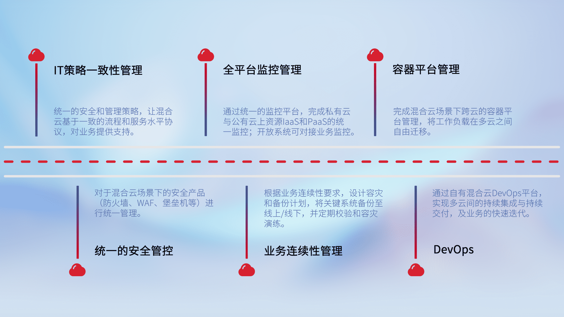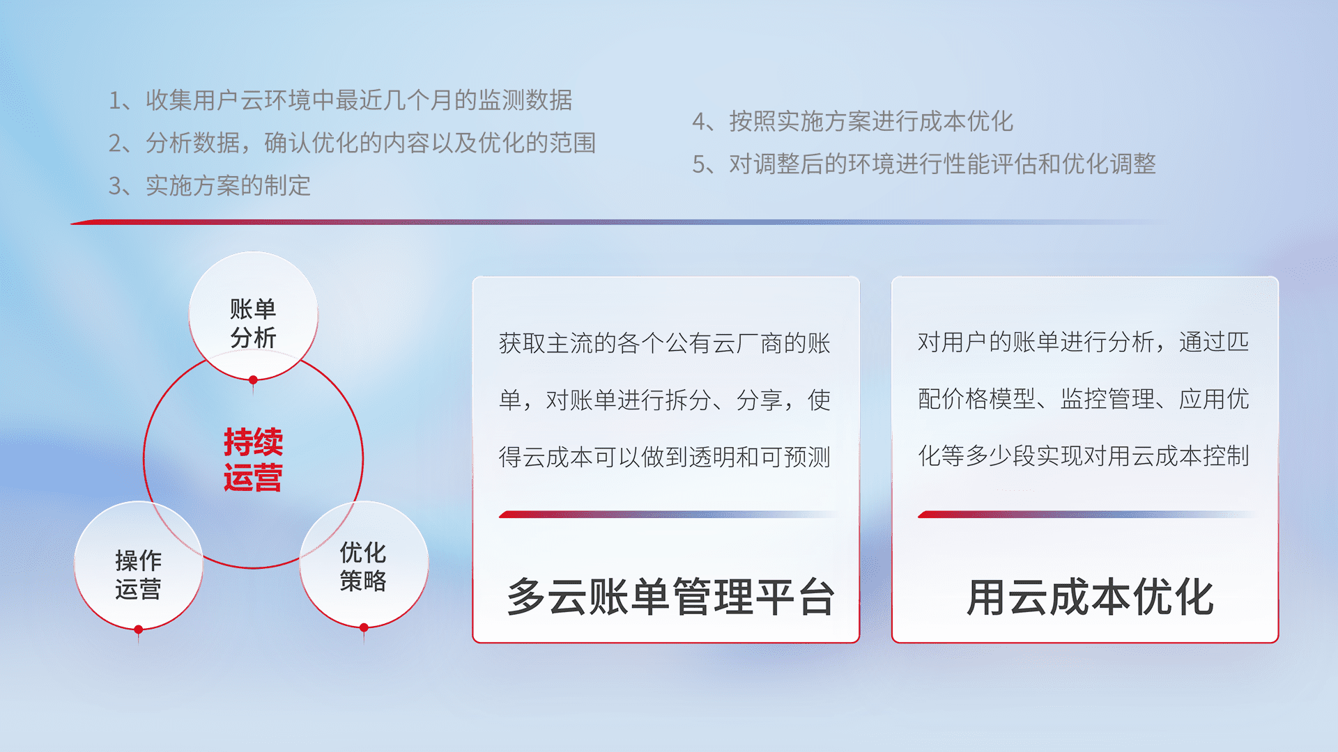 通过多云纳管,,,以统一的资源数据模型把客户的云资源进行抽象和封装,,,进而实现对多云资源的统一操作,,,保障云资源管理的可靠性、、、、稳定性与可用性。。。。量身定制化运维内容,,配置、、、开发运维、、、补丁管理、、备份、、、监控、、认证和访问管理、、、审计和日常巡检等,,,,保障在用云过程中的可靠度,,,稳定度以及高可用率。。