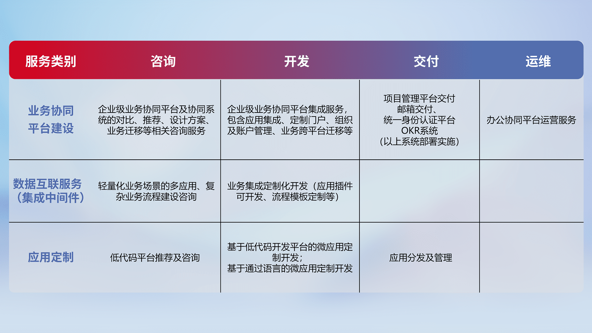 针对钉钉、、、、企微、、、、IDaas等平台级产品提供产品的规划、、方案、、、交付、、、、定制化开发等服务,,实现如统一协同办公、、智能客户服务、、混合会议管理、、、、智能数据查询、、等业务场景,,实现数字化转型。。。。